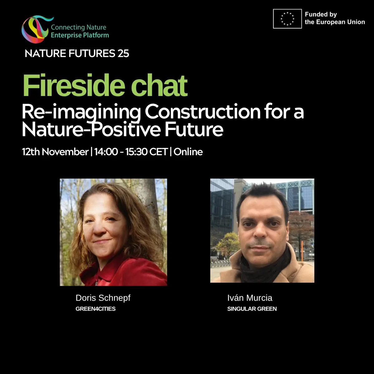 We also have a fireside chat, Re-imagining Construction for a Nature-Positive Future, featuring two nature-based enterprises, SingularGreen and Green4Cities, focused on integrating architecture and nature to develop urban green infrastructure and sustainable cities.