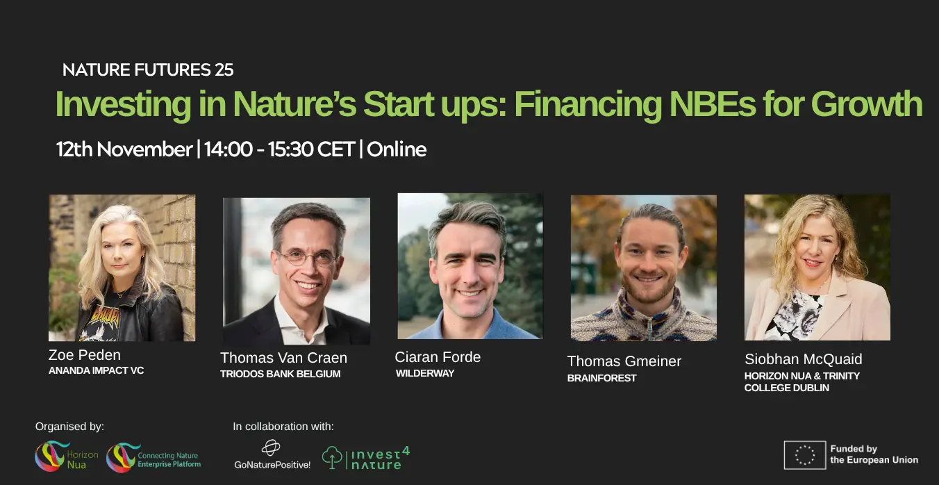We have a panel on ‘Investing in Nature’s Start-ups: Financing NBEs for Growth’ with Zoe Peden (Ananda Impact Ventures), Thomas Gmeiner (Brainforest Nature Accelerator), Thomas Van Craen (Triodos Bank Belgium) and Ciaran Forde (Wilderway). The session will be moderated by Siobhan McQuaid (Horizon Nua & Trinity College Dublin).