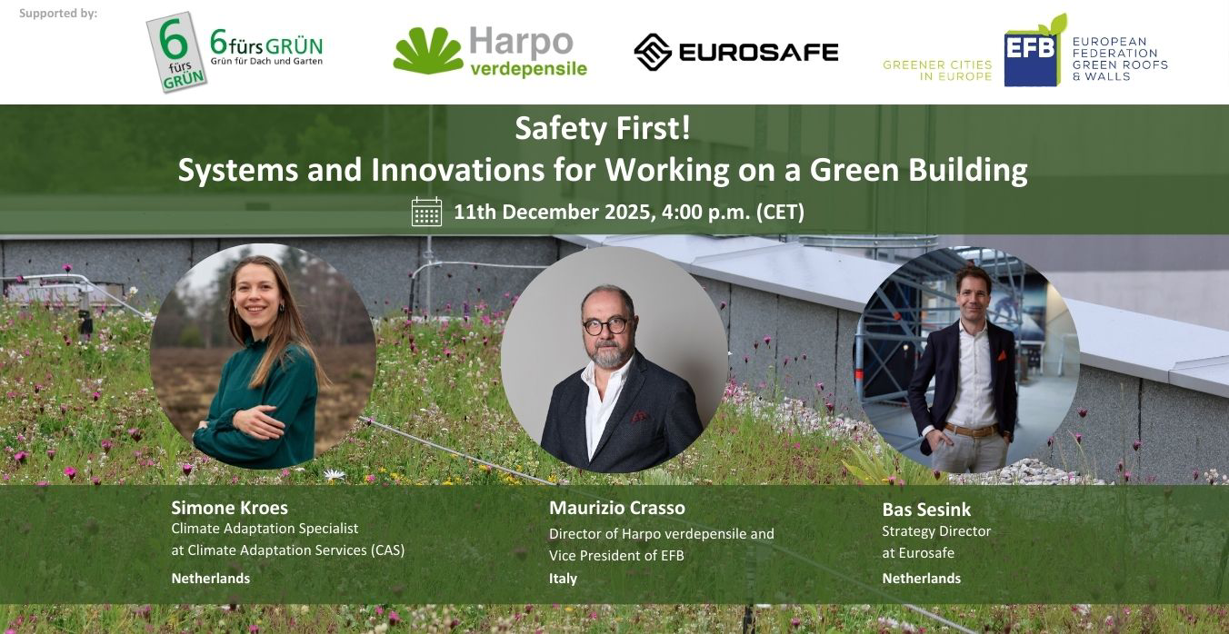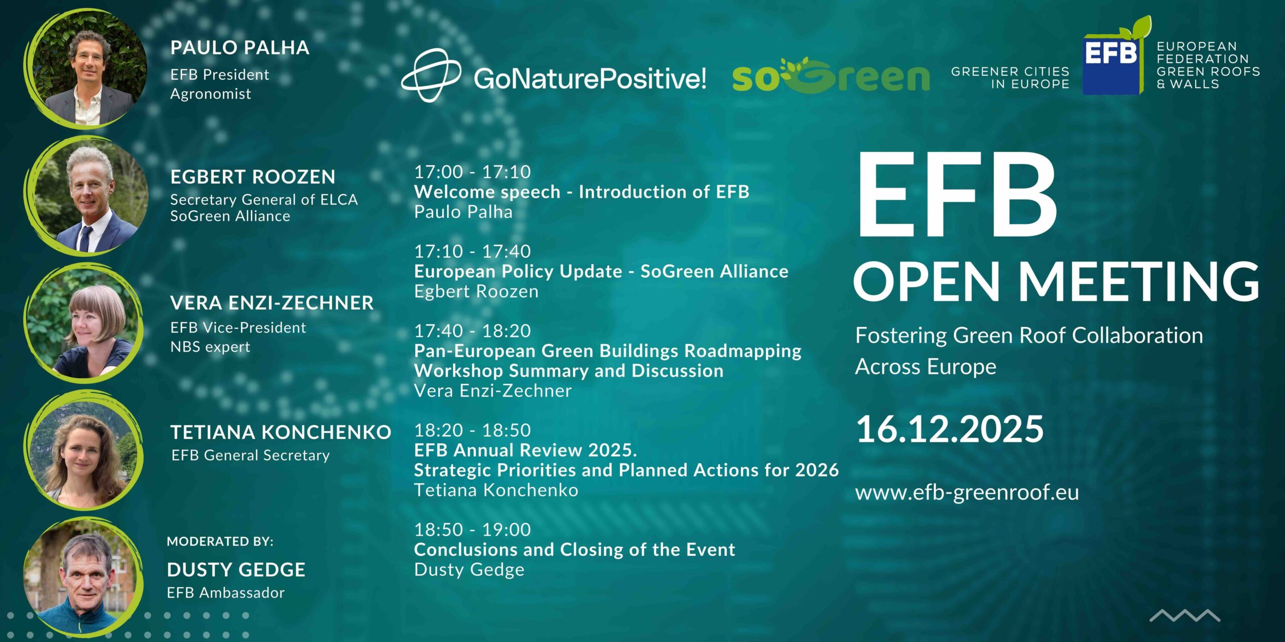 GoNaturePositive! Webinar “Policymaking for Green Buildings: From EU to National, Regional and Municipal Scale” Date: 17th September 2025 Time: 4:00 p.m. (CET) Platform: MS Teams Register here: https://naturebasedenterprise.com/networks/events/190455 Organiser: European Federation of Green Roof and Living Walls Associations (EFB) in collaboration with EFB Members: Associação Nacional de Coberturas Verdes (ANCV) and L’association de la végétalisation de l’îlot bâti et des infrastructures (ADIVET) Speakers: ...