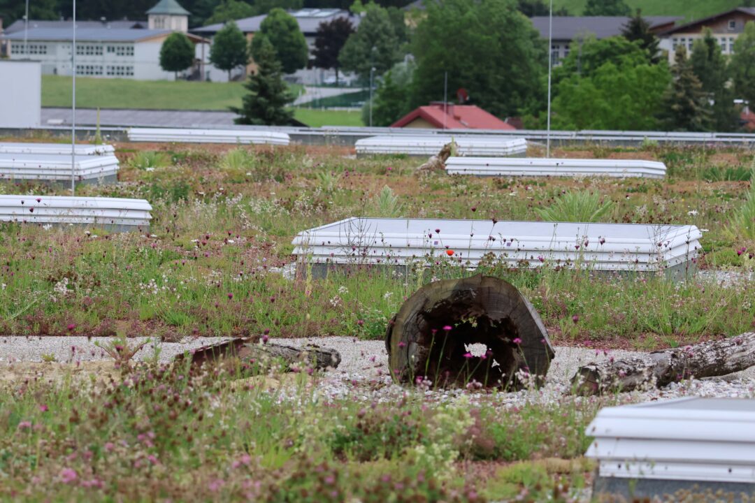 This roof was retrofitted with a biodiversity green roof. The 6660 m2 green roof verfügen elements such as gravel, dead wood, sand palces and a big variety of wildflowers to attract many insects and invertebrates.